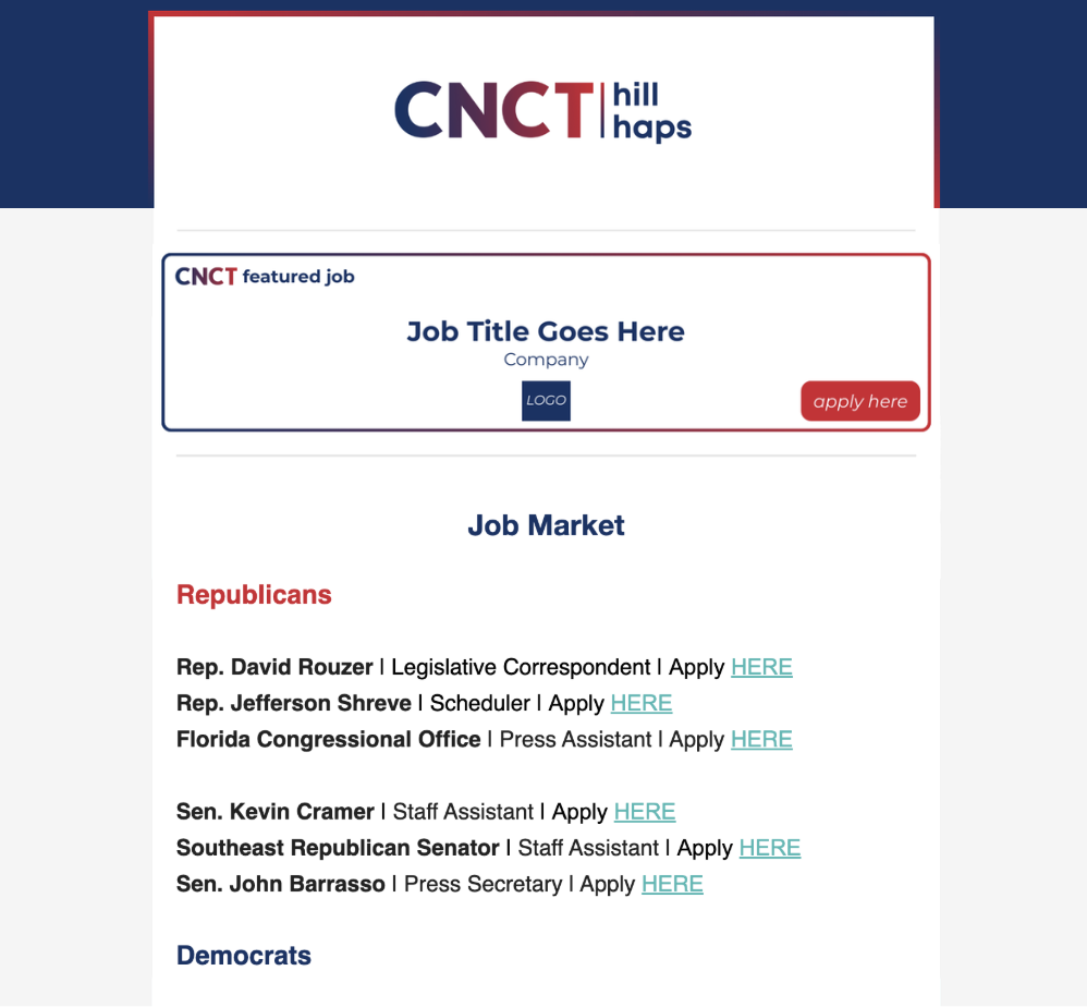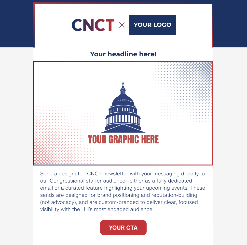Put your brand in front of DC’s most influential audience: Congressional staffers. With CNCT, you can promote your event, job opening, or message through our trusted newsletters, app placements, and direct email reach. Choose a budget-friendly sponsorship option below!